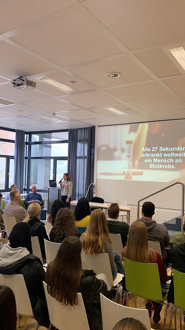 Karl Dieter erkrankte an Blutkrebs. Er erhielt eine lebensrettende Stammzellspende, die über die DKMS vermittelt wurde. Später konnte er seinen Spender kennenlernen: Eine bewegende Begegnung. Auch ihm ist es wichtig, den Schülerinnen und Schüler seine Geschichte zu erzählen und für die Registrierung als Spender Werbung zu machen.